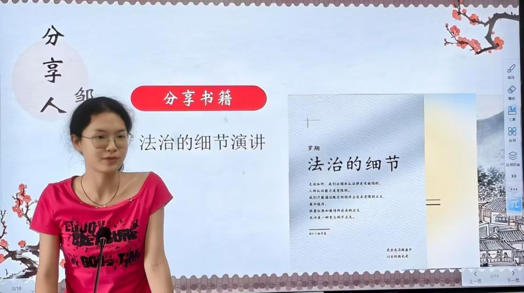 活动现场,部分同学依次登台,结合阅读体验与思考,分享了深刻的读书心得与独到的思想感悟。邹晓梅以罗翔所著《法治的细节》为切入点,结合书中对具体法治案例的深度剖析,畅谈了自身对法治精神在现实生活中具象化体现的理解,她表示,这本书成功将抽象的法治概念转化为鲜活可感的生活实践,让自己对法治的认知更进一层。陈柯弟则分享了林达的《历史深处的忧虑》,他围绕书中所展现的美国社会在法治与自由等维度的内容,深入阐述了自己从中获得的对不同社会法治文化差异的思考与启示。其他同学亦结合各自所选书籍,条理清晰地分享了阅读过程中的深刻感悟与成长收获,引发了现场同学们的强烈共鸣与热烈讨论。