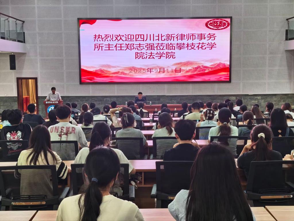 为帮助法学专业学子搭建起理论与实务对接的桥梁, 攀枝花学院法学院于9月11日下午两点在图书馆学术报告厅开展律师职业分享会,本次会议由法学院院长杨开华主持,四川北新律师事务所主任郑志强出席,2023级法学3班以及2024级法学3班部分同学参与。