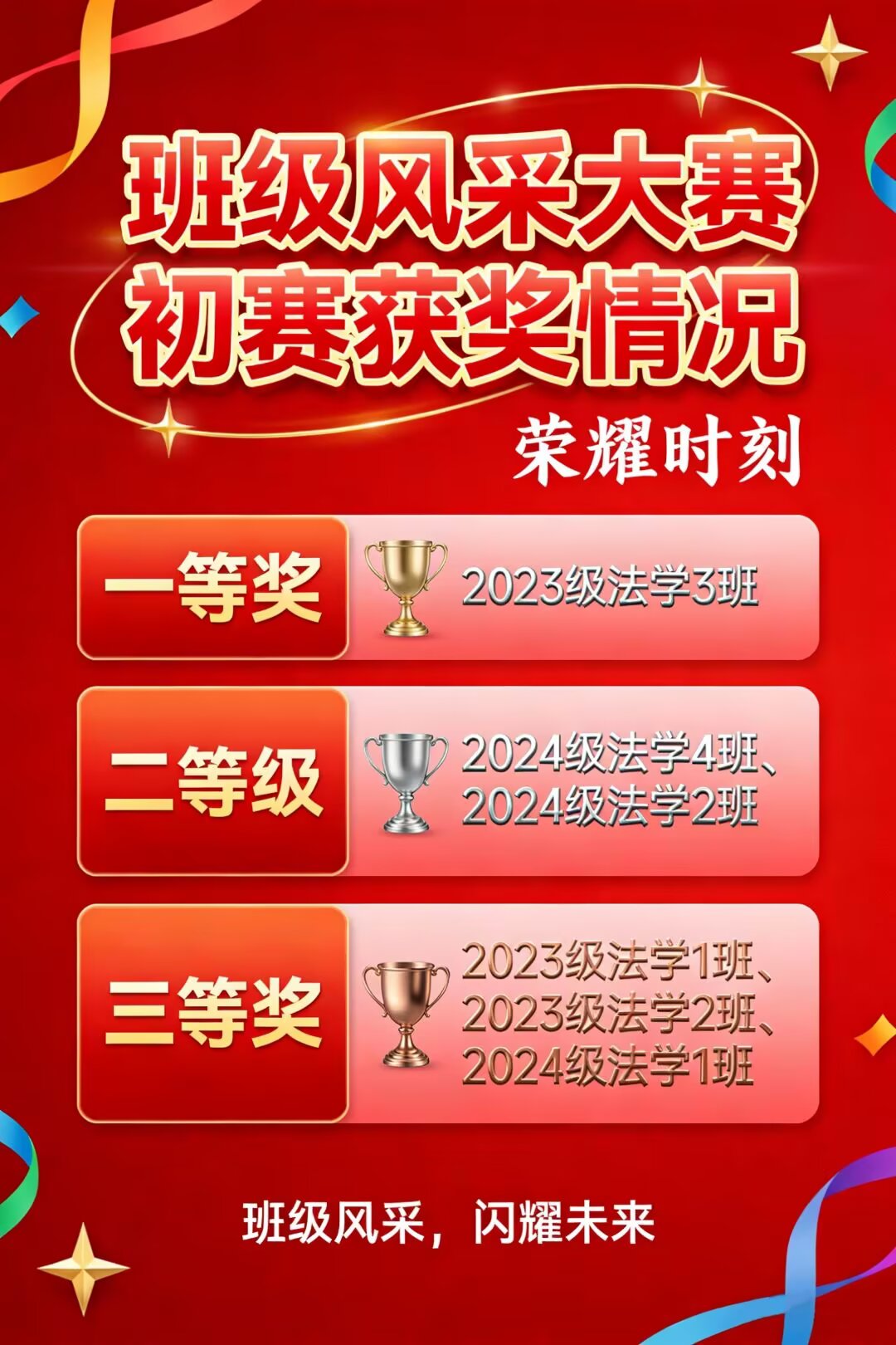 经过激烈角逐与评委专业评审,本次大赛获奖情况最终揭晓:2023级法学3班斩获一等奖;2024级法学4班、2024级法学2班荣获二等奖;2023级法学1班、2023级法学2班、2024级法学1班获得三等奖。