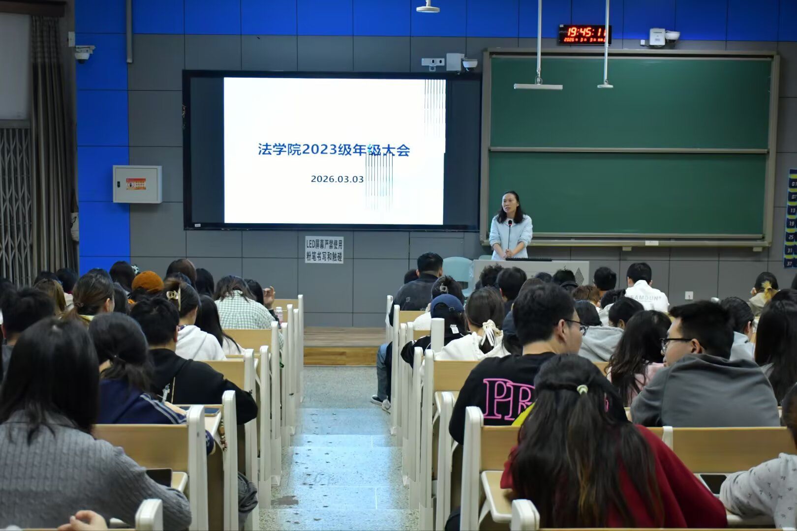 为进一步加强学风建设、明确发展方向、凝聚年级力量,3月3日19:40,法学院在1-116教室召开2023级年级大会。本次大会由2023级辅导员王霞主持,法学院院长杨开华出席会议,2023级全体学生参会。 会议伊始,杨开华发表讲话,重点阐释考研深造的重要价值。他指出,当前法治人才需求日趋专业化、精细化,提升学历层次、深化专业素养,既是增强个人核心竞争力的关键途径,也是未来从事法律职业、实现长远发展的重要基础。 随后,王霞围绕假期学习与新学期收心工作作出部署,要求全体同学迅速调整状态,从假期模式切换至学习模式,做到及时收心、静心、专心,以饱满的精神面貌投入新学期专业学习。同时,她叮嘱同学们合理规划学习时间、端正学习态度、严守课堂纪律,保持良好学习习惯与浓厚学习氛围,勤学善思、笃行不怠,为新学期各项学习任务筑牢基础。 此次年级大会的召开,不仅为2023级同学指明了学业规划的方向,更吹响了新学期奋进的号角,为全体同学在大三这一关键节点凝心聚力、整装出发奠定了坚实基础。